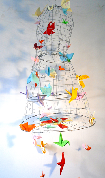 Es tracta d’una escultura feta amb filferro reciclat i tramat manualment, del cos d’una dona aproximadament de 1’20 m. d’alçada, que és alhora una gàbia d’ocells amb la seva porta oberta. Molts ocells de colors fets amb papiroflèxia i amb pensaments escrits per fer-nos lliures, han sortit d’ella i han volat de la gàbia. Part d’aquests pensaments els han escrits alumnes de 3r d’ESO que van participar a la dinàmica feta per la XAJI al nostre Centre.