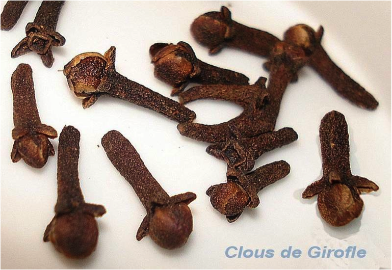 Le clou de girofle est obtenu d’un arbre originaire de l’Indonésie. Ce sont des boutons floraux qui sont cueillis avant qu’ils fleurissent et sont séchés au soleil. Le résultat est un produit brun et dur d’environ 12 mm de long à la saveur piquante et très parfumée.