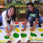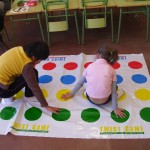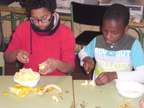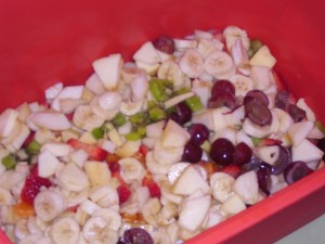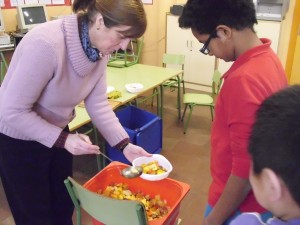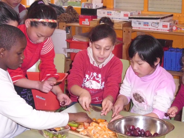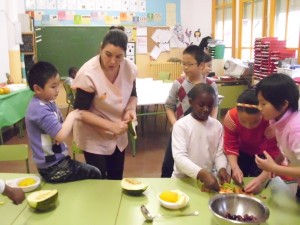 Parem la taula, ens rentem les mans i les fruites, i les comencem a tallar en trossos petits. Les barregem i les posem em plats petits.