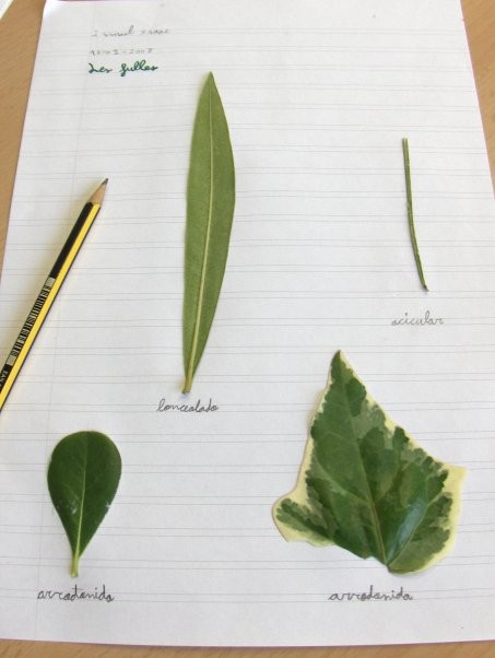 Els nens i nenes de tercer estem estudiant les parts d’una planta: arrel, tija i fulles. Avui hem portat fulles a l’aula de ciències. Ja hem après que a les fulles hi distingim: limbe, pecíol i nervis. També que si ens fixem en la forma del limbe les podem classificar en: arrodonides, cordiformes, lanceolades i aciculars.