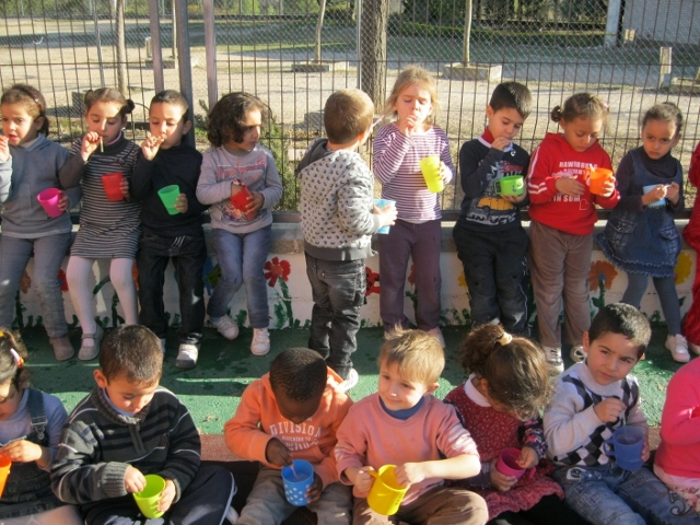 Els alumnes de educació infantil (P-4) hem experimentat amb les possibilitats de l’aigua i el sabó. Hem sortit al pati de l’escola amb un gotet i una canyeta i hem bufat molt fort. Semblava màgic !!!!!! També hem observat les característiques de les bombolles: la forma ( esfera) i que són translúcides. Però el més important és que s’ho hem passat “bomba”.