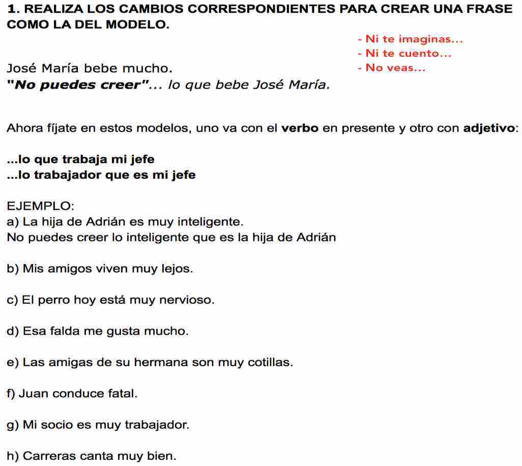 Más tarde corregimos la página 22 del libro de Gramática, que trata sobre la sustantivación, centrándose en el uso del artículo neutro lo que acompaña a adjetivos, adverbios o frases de carácter enfático. Ampliamos estos ejercicios con otras propuestas como estas: