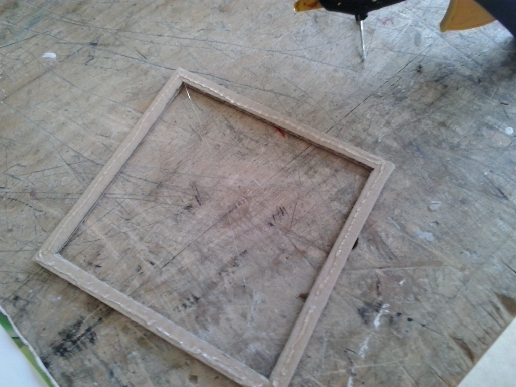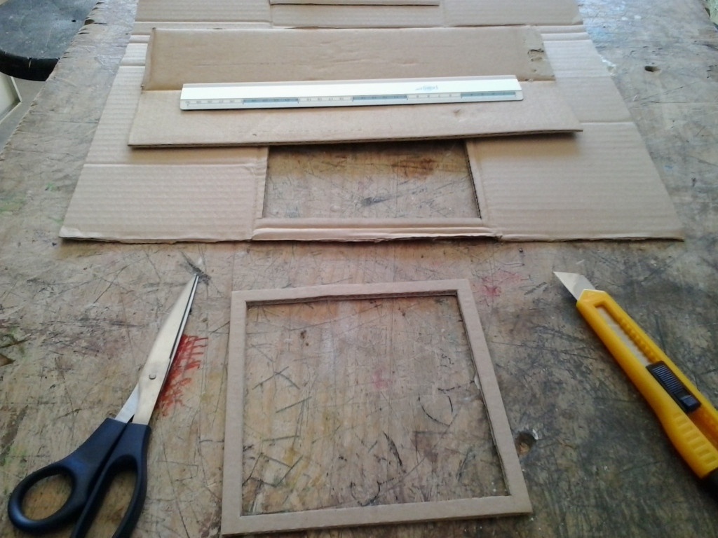 Utilitza el marc que has retallat per a marcar un quadrat al cartró prim. Posteriorment, marca un nou quadrat a 5 mm del primer.