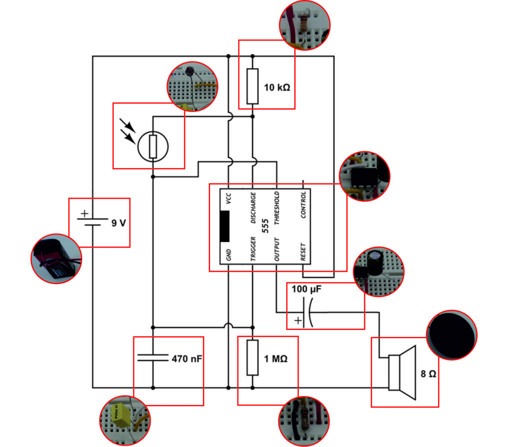 - Finalment, col·loca la fotoresistència i el condensador de 100 μF (tingues en compte la polaritat) i connecta l’altaveu al circuit amb els cables d’interconnexió.