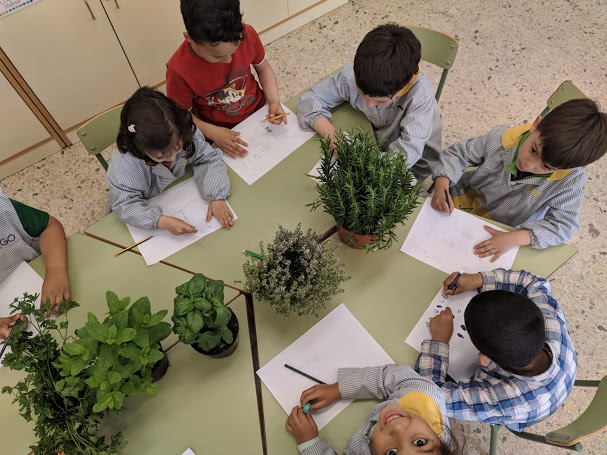 Amb mig grup les hem observat, olorat i dibuixat la forma de les fulles. També hem jugat a endevinar-les només amb la olor. Finalment hem baixat al pati tots junts i les hem plantat i regat.