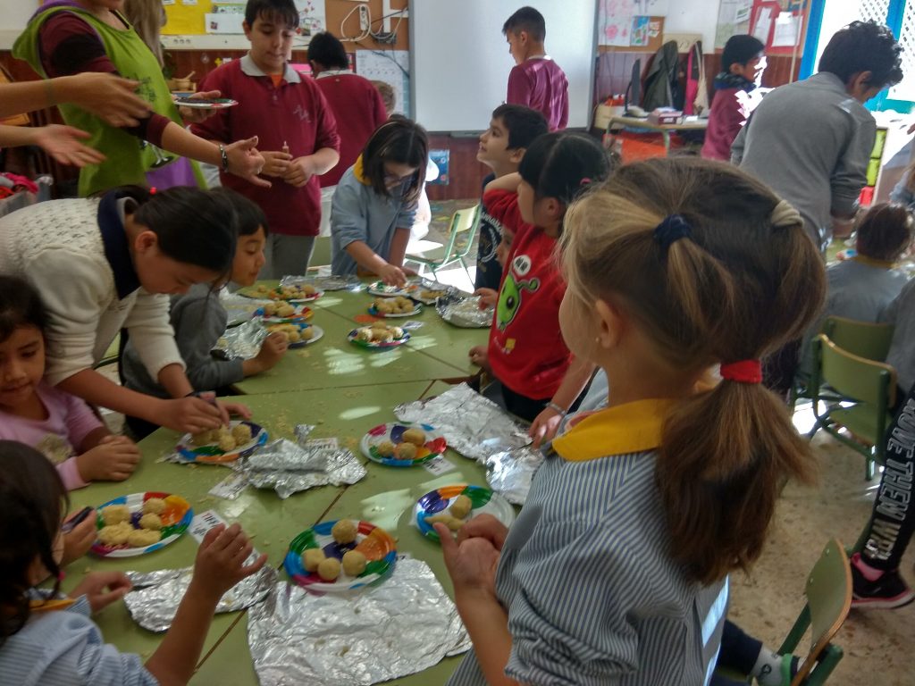 Els nens i nenes de P3, P4 i P5 per celebrar la Castanyada hem fem panellets amb l’ajuda dels nostres companys i companyes de 5è!