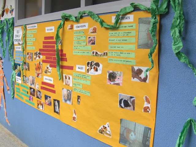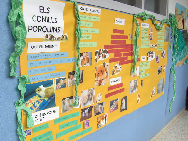 Hem fet un mural i l’hem penjat a fora de la classe. En el mural hi apuntem tot el què estem aprenent. Per saber-ne coses hem portat uns conills porquins a classe i els hem observat. Els hi hem posat un nom: el conill mascle es diu Titus i a la femella Tita. Els hem cuidat, observat, dibuixat, tocat, hem fet fotos…