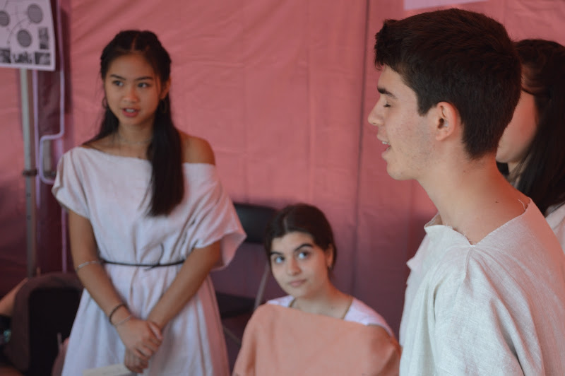 Aquesta part va ser molt divertida, arribats al Museu ben d’hora, ens van presentar els alumnes de l’altre centre, l’Escola Vedruna-Gràcia, després vam anar cap a l’escola La Cultural per vestir-nos, sense oblidar deixar les joies i altres objectes perquè fos més semblant a l’època que reconstruíem. Cadascú tenía assignada una túnica i, a part, ens vam fer uns pentinats adients per a l’ocasió. Un cop enllestit això, vam preparar les carpes on anàvem a passar el dia, vam recollir l’esmorzar i ens vam llençar a l’aventura. En arribar l’hora de dinar, el museu ens va donar uns tiquets per poder agafar el menjar, durant aquesta estona va ser quan vam socialitzar més amb l’altre institut i quan ens vam fer més amics.