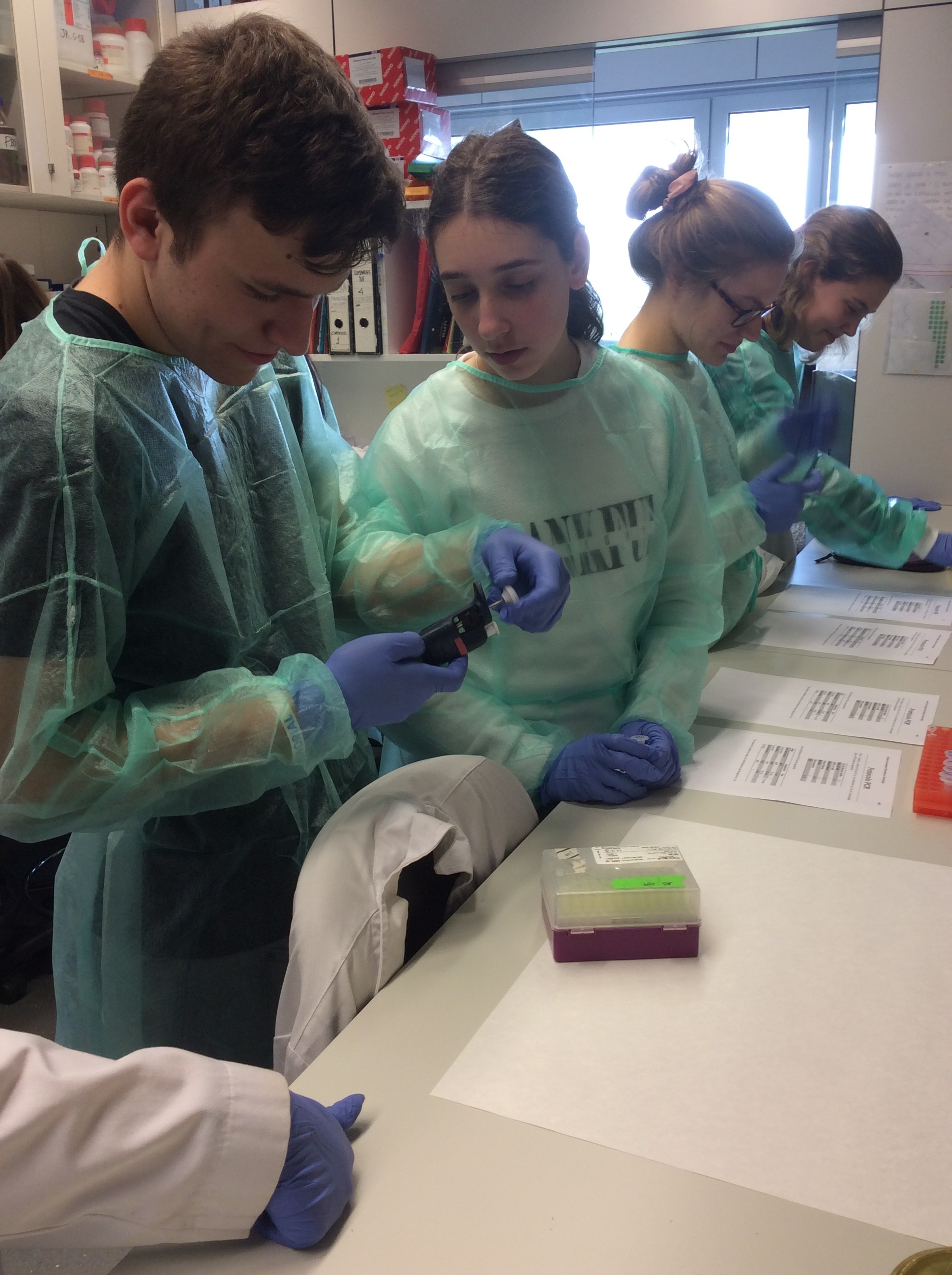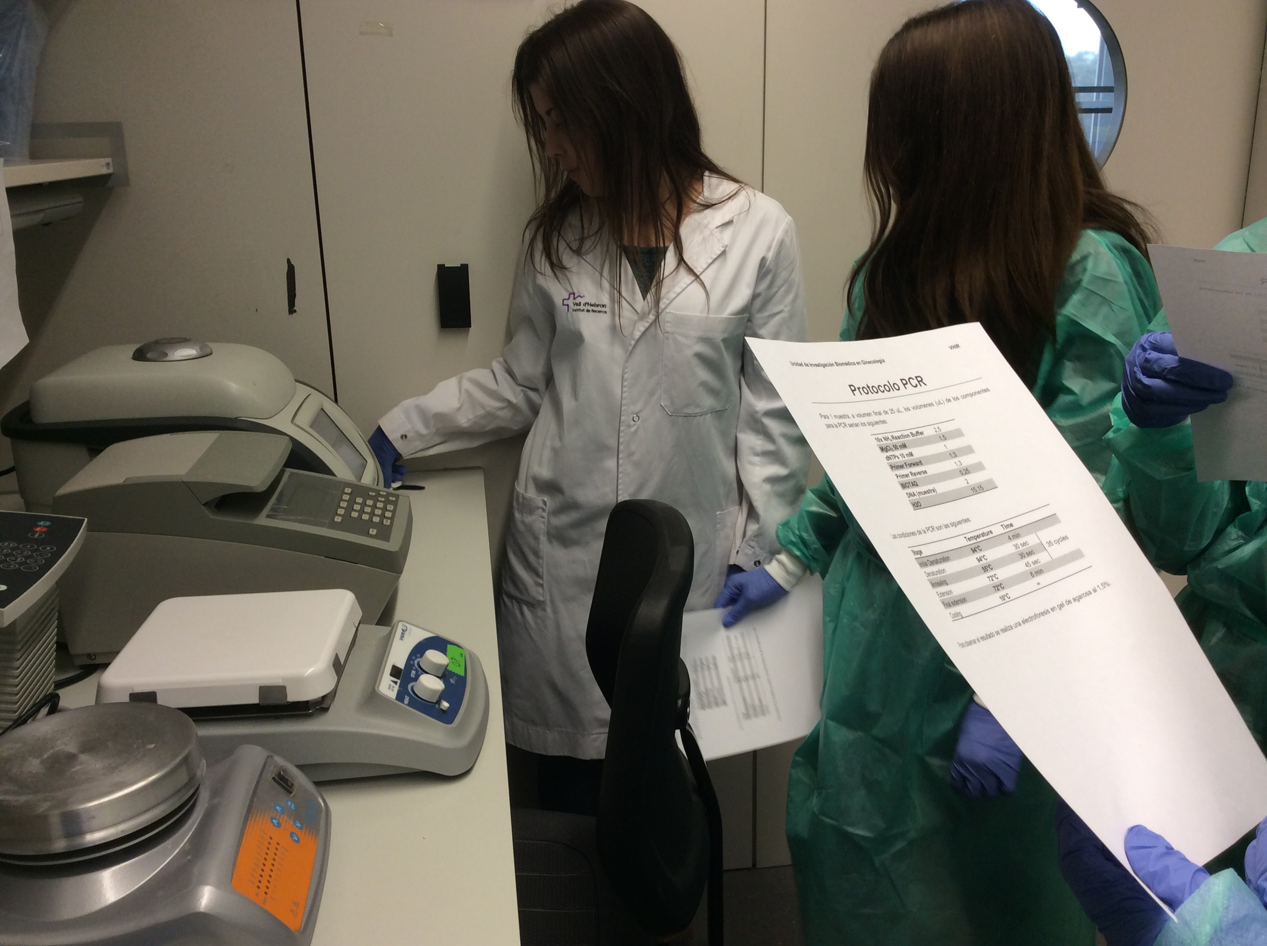 L’equip de recerca de l’IRVH havia preparat una senzilla pràctica perquè poguéssim provar aquesta tècnica.Primerament vam haver de preparar tot el material que s’introdueix a la PCR. Anàvem seguint un protocol on s’indicava quin volum havíem d’agafar de cada substància. Calia utilitzar unes pipetes especials, un pèl complicades al principi, per poder agafar volums tan petits.