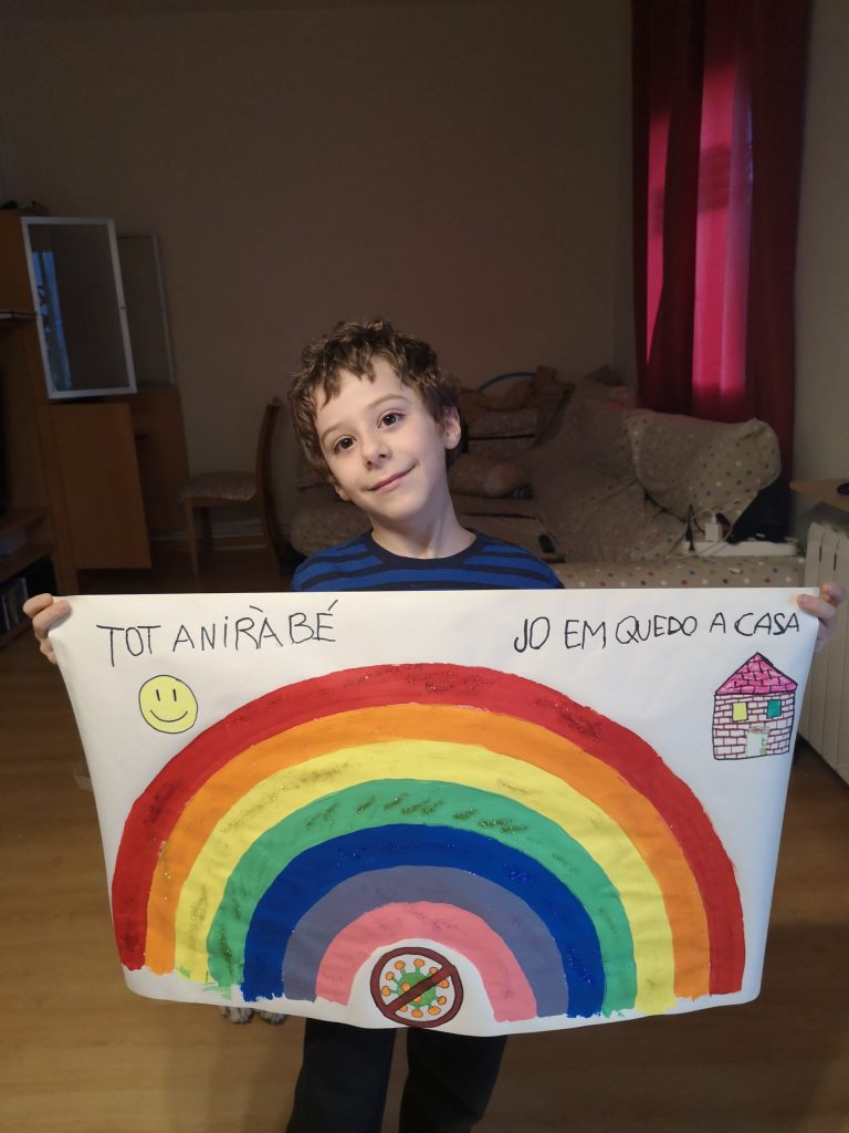 A moltes ciutats els infants fan cartells d’aquests tipus, amb missatges d’ànims i un JO EM QUEDO A CASA, i els penjen als balcons, així quan miren per les finestres i veuen un altre cartell saben que allà hi ha un infant, passant el mateix que ells.