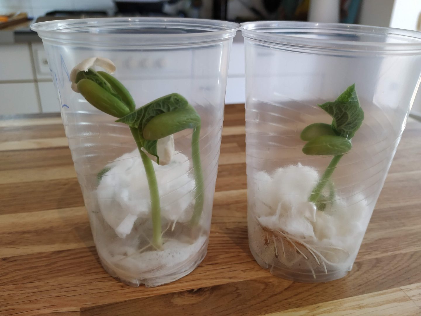 VAM POSAR UNES MONEGETES SEQUES EN UN GOT AMB COTÓ I HO VAM REGAR AMB AIGUA. AL CAP D’UNA DIES VAN COMENÇAR A SORTIR UNES TIGES BLANQUESI DESPRÉS ES VAN FER VERDES.