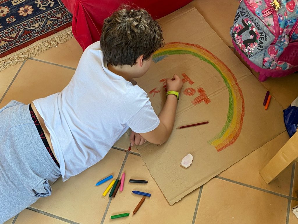 Hem dibuixat un arc iris amb uns núvols i els hem pintat amb ceres. Després, hem posat el text “Tot anirà bé” i també en italià, “Tutto andrà bene”, perquè ens hem inspirat molt en les accions que han anat fent a Itàlia amb això del coronavirus.
