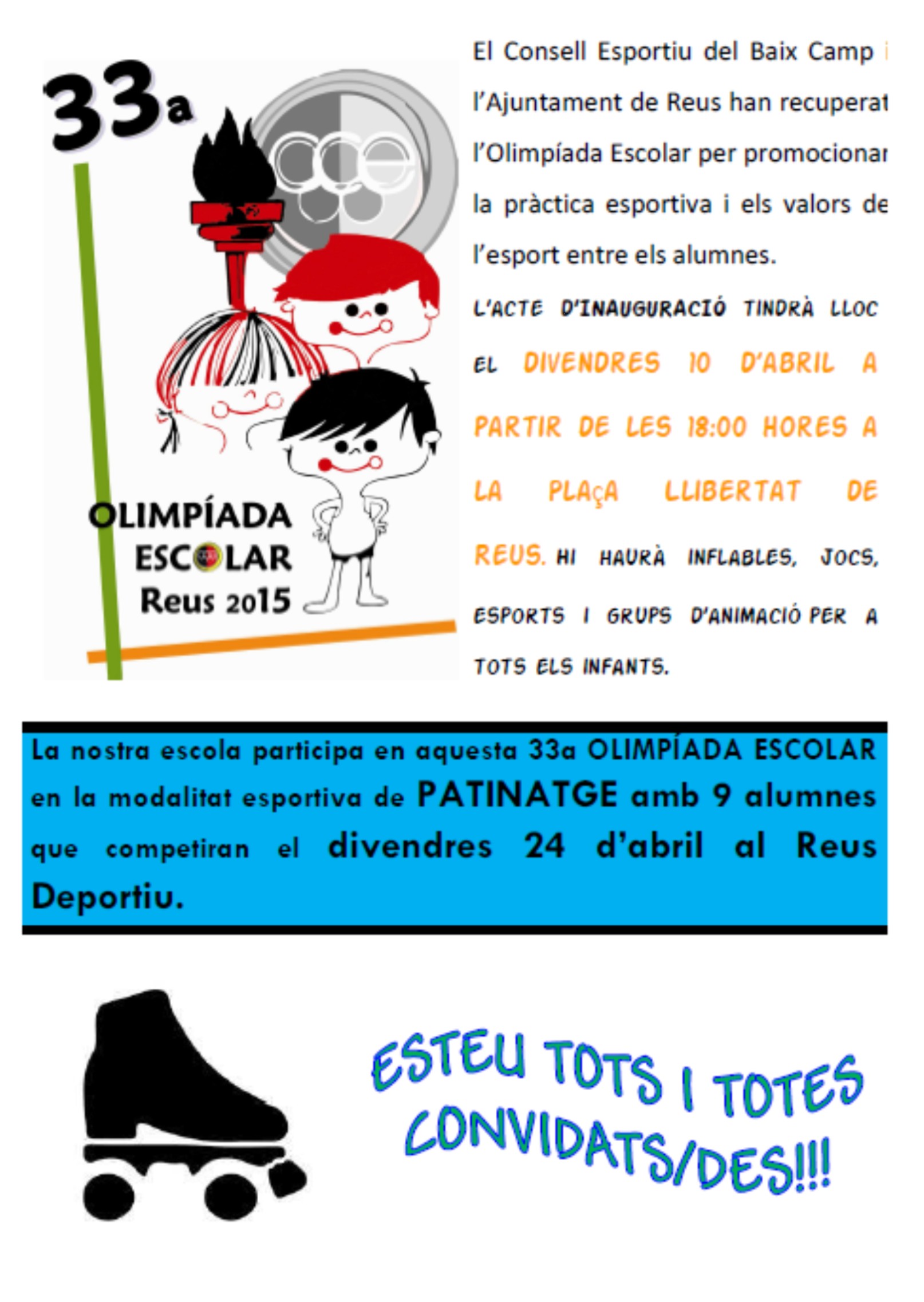 Divendres 24 d’abril, al pavelló del Reus Deportiu, es va disputar la competició de patinatge. Va ser un espectacle sobre patins i vam gaudir molt de totes les actuacions, però en especial, les de les nostres patinadores que estaven guapíssimes i van representar fantàsticament bé l’escola.