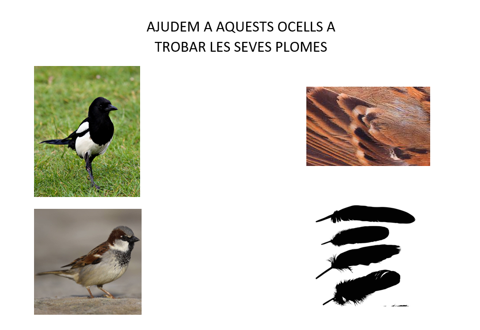 Buscarem pel passadís les plomes dels tres ocells que volem treballar. Prèviament, la mestra les haurà amagat. Una vegada les hem trobat, es realitzarà en la PDI una activitat de relacionar. Els infants han d’unir l’ocell amb la seva ploma.