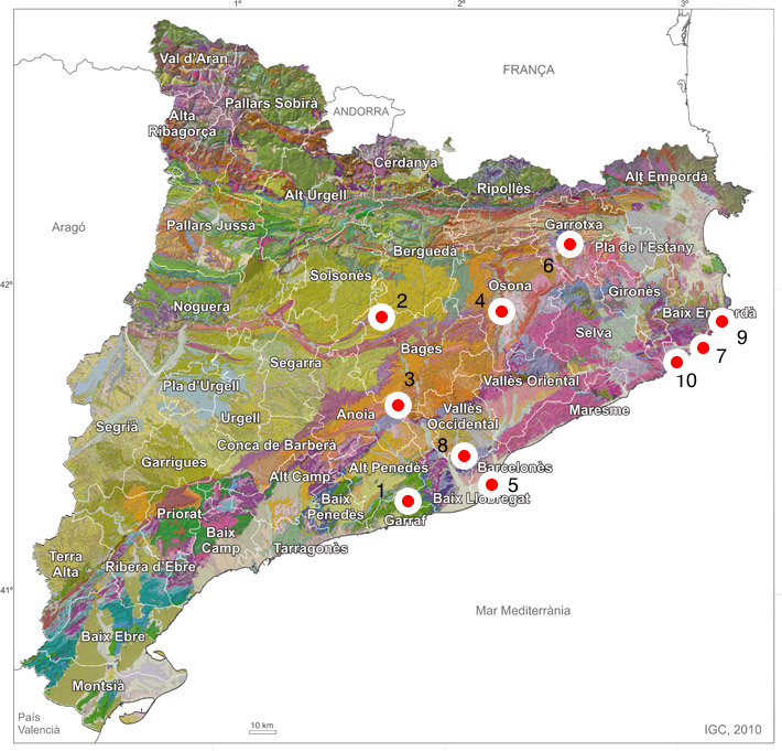 Mapa geològic comarcal de Catalunya (ICGC) amb localització dels exemples següents (Espais inventariats d’interès geològic de Catalunya)