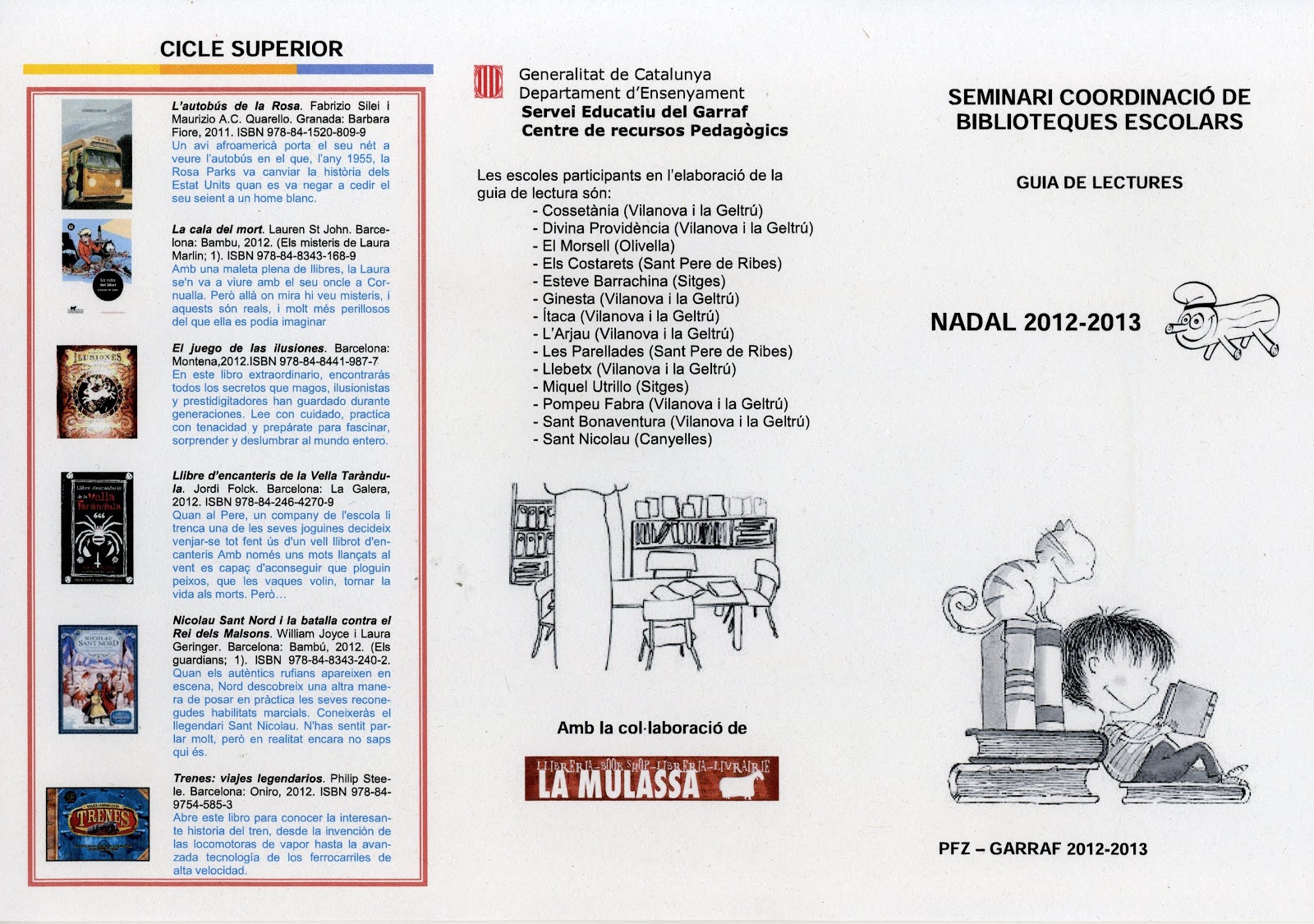 Segur que ja esteu pensant en els llibres que regalarem per Nadal. El trineu del Pare Noel i les sàrries dels camells dels tres Reis Mags estan plenes de llibres de tot tipus, per a menuts, joves i adults i tots… superxulos. Com que hi ha tants i tants llibres, des de la biblioteca també us oferim la guia de lectura (que hem elaborat al Seminari de biblioteques escolars del Garraf).