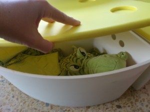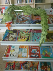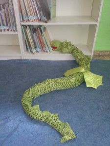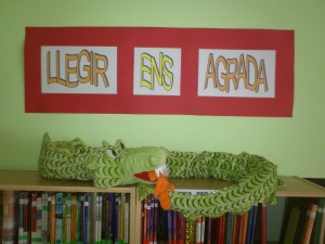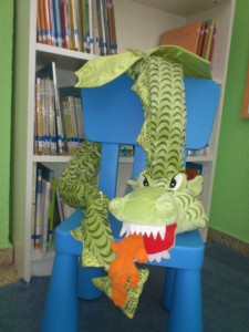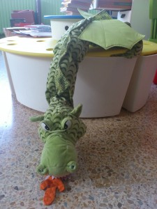 És un drac de peluix màgic… perquè per la nit i quan no hi ha ningú a l’escola, surt del seu cau i es passeja per la biblioteca.