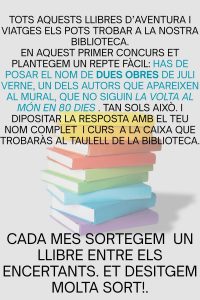 Després d’un llarg període,reprenem de nou el nostre blog amb el concurs basat en el fons de la nostra biblioteca. Aquest primer mes el dediquem als llibres sobre viatges, i , com podreu veure, contestar i encertar és ben fàcil. Et mostrem un seguit de llibres d’aquesta temàtica que podràs trobar a la biblioteca, i una pregunta ben fàcil. Tan sols has de contestar-la, posar el paper amb la resposta i les teves dades a la caixeta que tens al taulell de la biblioteca, i participaràs en el sorteig d’un llibre. Anima’t a participar!