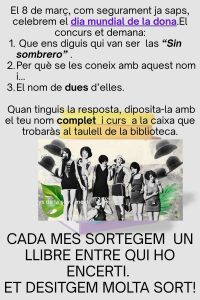 Ja tenim aquí el nou concurs mensual que us plantegem a partir de recomanacions literàries. Aquest mes de març, un recull d’obres de dones destacades que podeu, com sempre, consultar a la nostra biblioteca. I un nou repte.