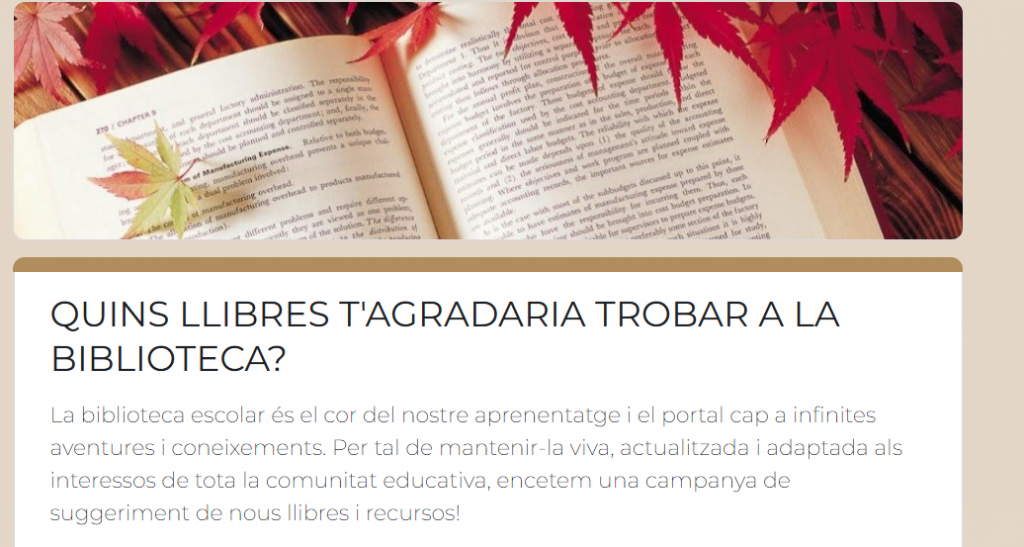 | Participants | Alumnat de 6è (Membres del projecte de Biblioteca Escolar). De forma individual o petits grups. |
