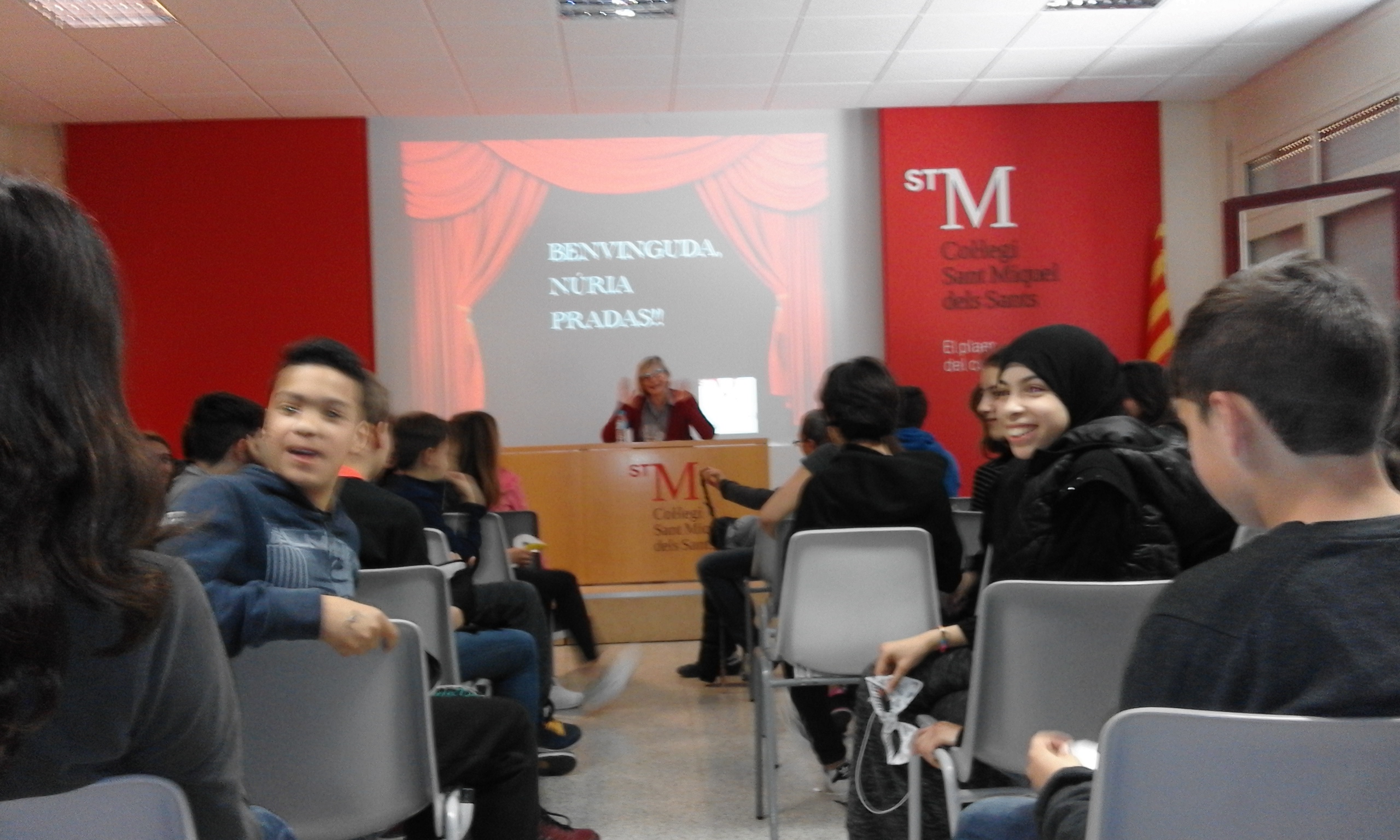 Ha entrat a l’escola pocs minuts abans de les 15h. I en breu han aparegut els protagonistes de la novel·la a donar-li la benvinguda. Una visita al director,que ha portat a una conversa sobre un noi desaparegut ha obligat a la Núria i els seus acompanyants a endinsar-se a la cerca de pistes per totl’edifici …Finalment han arribat a la sala d’actes on tots els alumnes l’esperaven amb màscares. Ha sigut una rebuda espectacular, la sala d’actes era de color roig i la Núria ha quedat molt impressionada amb la música i la presentació en format powerpoint que dos alumnes han preparat . Un èxit de benvinguda.