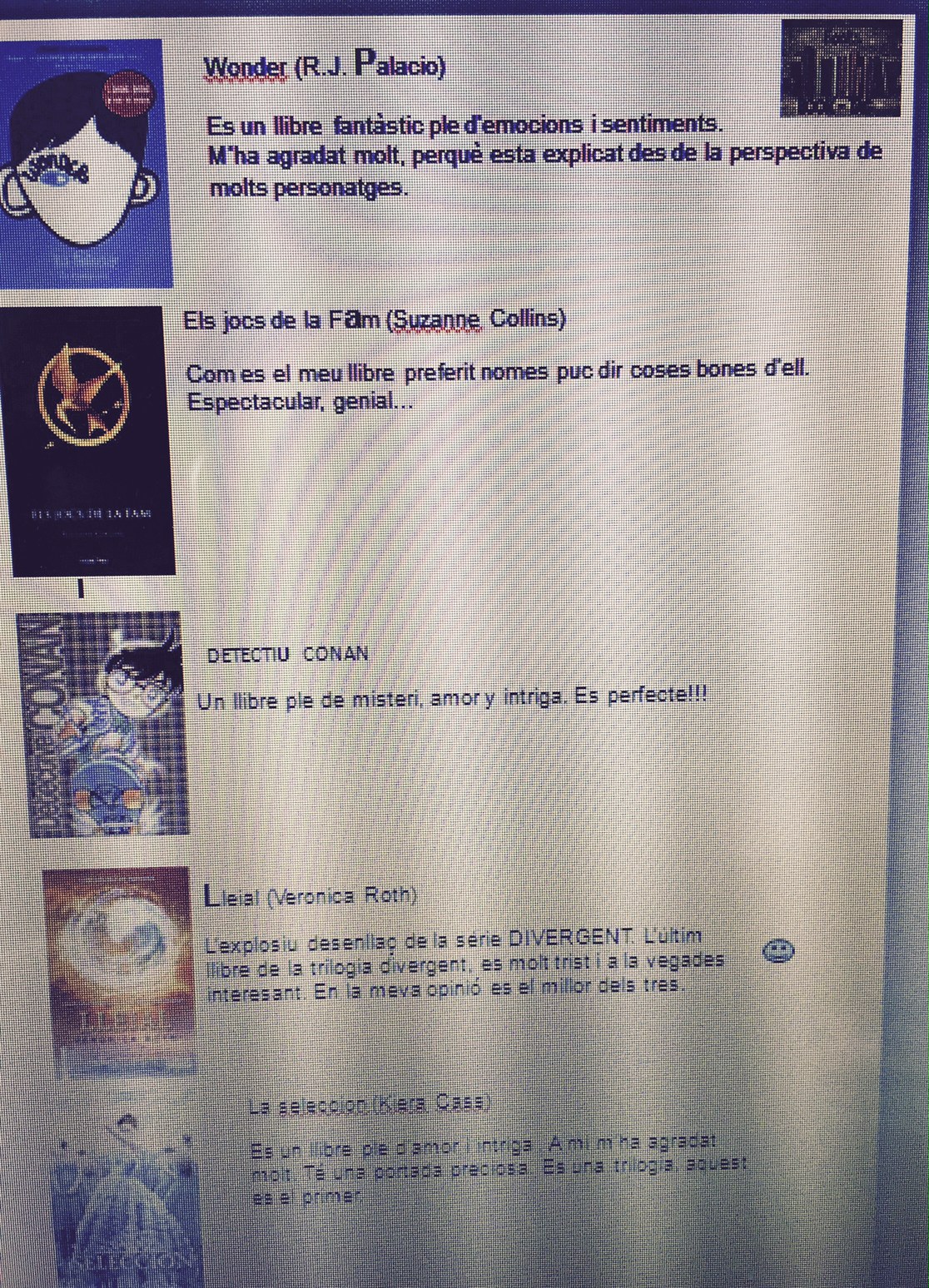 Els i les alumnes de 6è estan realitzant el book tag del seu nom. L’activitat consisteix en pensar llibres que s’hagin llegit, que es vulguin llegir… en definitiva que els interessin i que o bé comencin per les inicials del seu nom i dels seus cognoms o bé continguin la seva inicial. Aquí us en deixem una mostra: