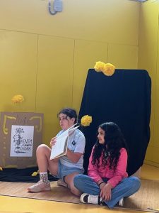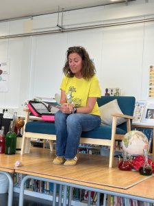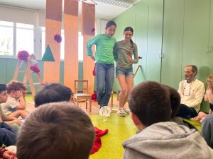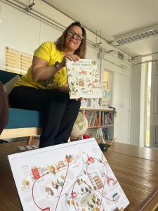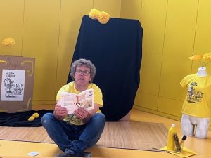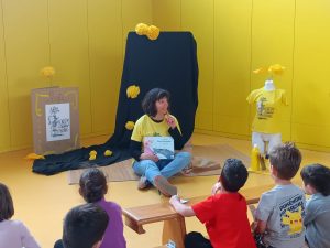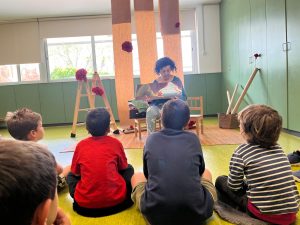 El dia de Sant Jordi el matí l’escola es vesteix de gala amb diferents escenaris a varis llocs de l’escola. A  cada escenari podem escoltar diferents membres de la Comunitat Educativa que ens narren un conte, una rondalla, ens reciten un poema, ens dramatitzen algun fragment de llibre, ens expliquen una història amb un altre idioma, entre d’altres. El conjunt d’actuacions que té lloc a un espai duren uns 20 minuts i després a ritme d’una música tranquil·la tant els lectors/actors com el públic ens desplacem fins a un altre escenari i gaudim d’unes altres posades en escena.