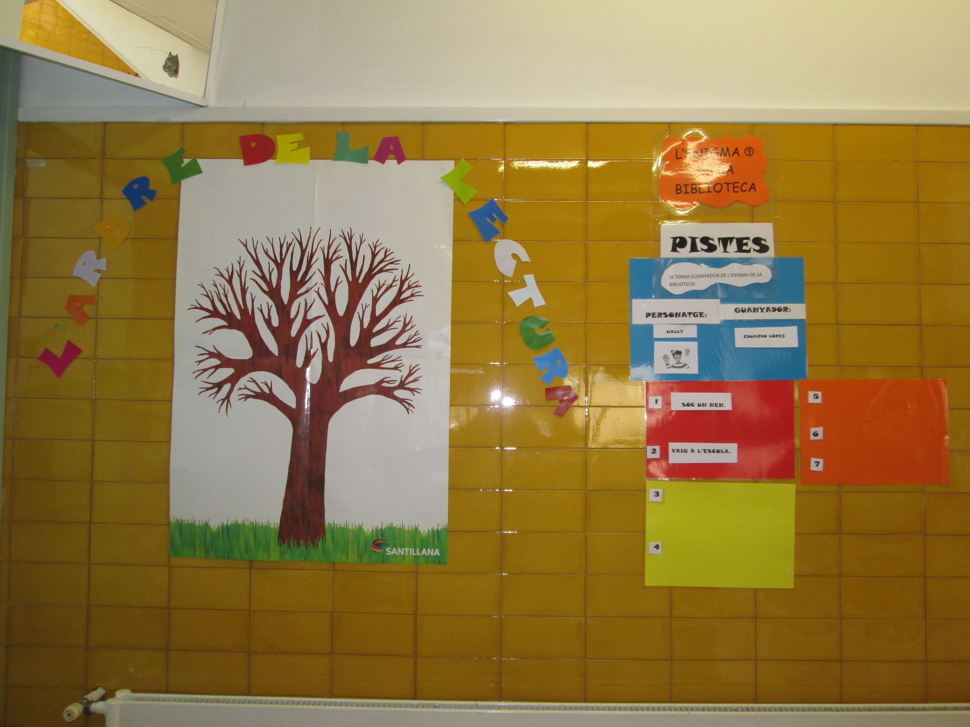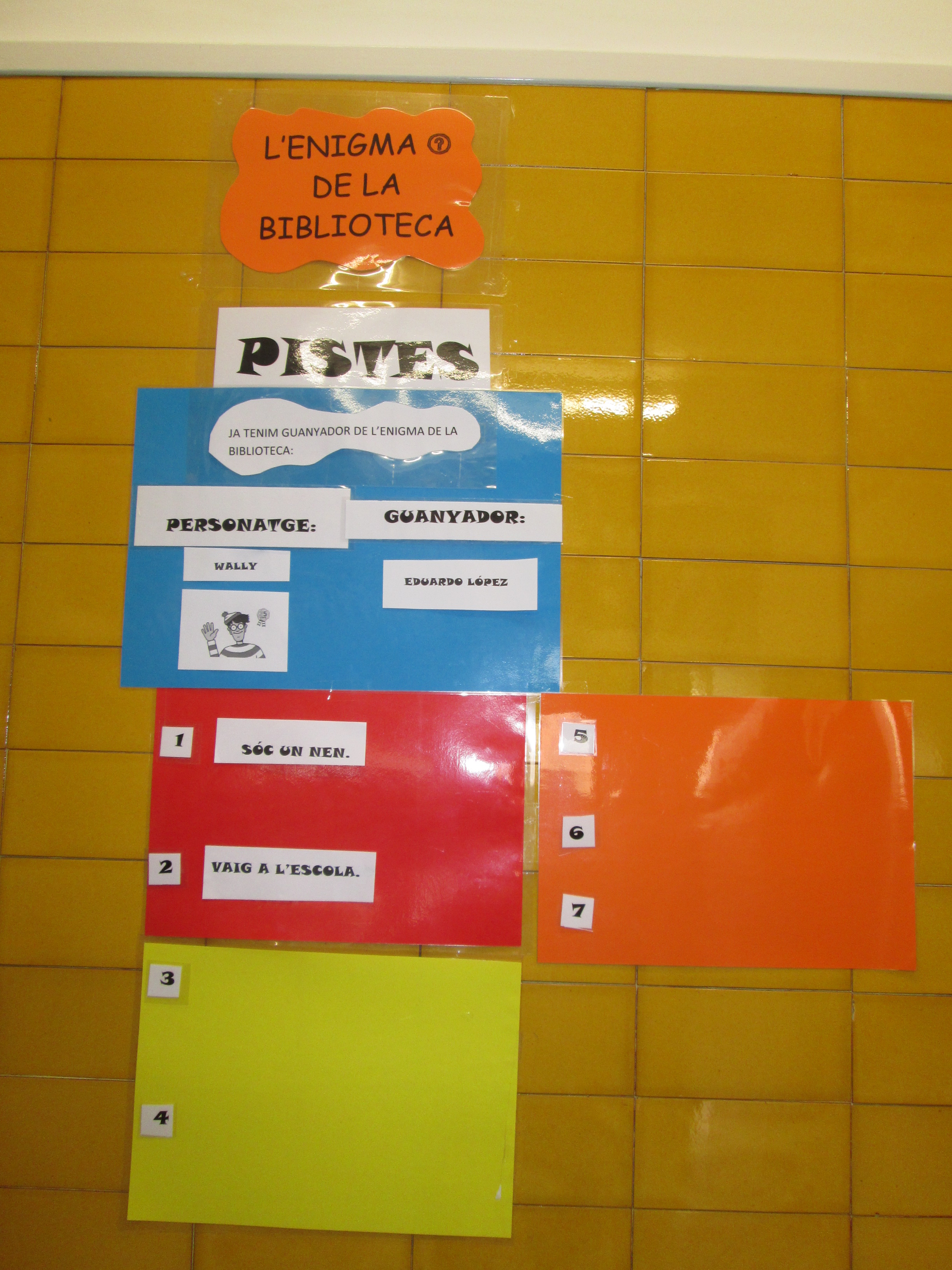 La comissió de biblioteca proposa un joc de pistes per encertar personatges coneguts de la bibliografia infantil. Cada setmana posen una pista a l’entrada de la biblioteca i els alumnes poden escriure la resposta i ficar-la en una capsa que hi ha al costat. El primer nen o nena que l’encerta té un detallet.