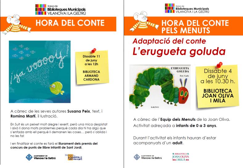 Els propers dissabtes de JUNY hi ha dues hores del conte a les biblioteques de Vilanova.