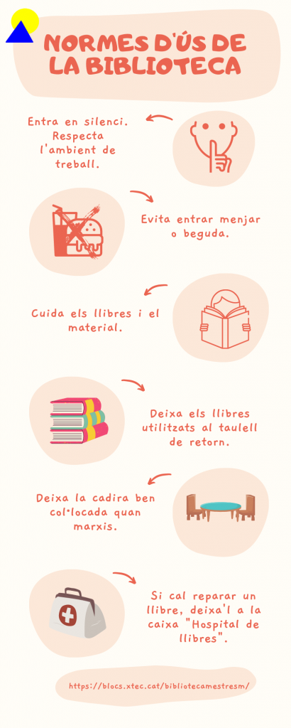 La biblioteca obre dos dies a la setmana, dilluns i dimecres, de 16.30 a 17.30 h, poden assistir-hi tots els alumnes acompanyats d’un adult, l’alumnat de cicle superior pot assistir sol, però hauran de tenir una nota a l’agenda on diu que marxaran sols.