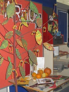 A la biblioteca li piquem l’ullet a la tardor: quatre carbassetes, els contes de la Maria Castanyera i un arbre amb unes fulles que tot i els seus colors tardorencs no cauran mai.