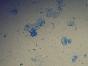 4- Per acabar, recordem com són les cèl·lules de la mucosa bucal. És evident que són cèl·lules animals. La següent imatge és força similar al que vosaltres mateixos vau observar al laboratori. Recorda que les veiem de color blau perquè les vam tenyir amb blau de metilè. La qualitat no és gaire bona, en comparació a les dues imatges anteriors, doncs pensa que aquesta imatge ha estat obtinguda amb microscopi òptic: