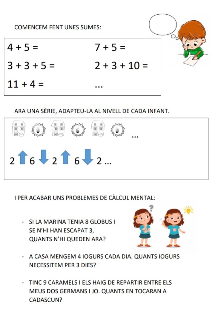 PENSEU QUE SEMPRE PODEU ADAPTAR LES SUMES, LES SERIACIONS I ELS PROBLEMES AL NIVELL QUE MÉS BÉ US VAGI. ÉS MÉS IMPORTANT FER UNA SUMA MOLT SENZILLETA QUE NO PAS INTENTAR FER-NE UNA DE DIFÍCIL I QUE NO ENS SURTI.