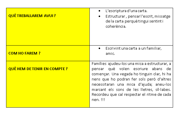 Bon dia! Avui escriurem unes cartes, tal com féiem a l’ambient de Bla-bla-bla. Així que, a escriure missatges per a amics, familiars, mestres… Bona feina!!!