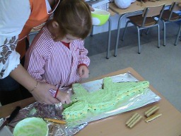 Aquest matí tots els nens i nenes de la classe del Jardí hem fet un pastís de dinosaure. Hem descobert com es barregen els colors i en surten uns altres amb els colorants alimentaris. Hem pogut fer tasques pròpies dels pastissers: tallar la massa, extendre la barreja per decorar pastissos, tallar i donar forma,…