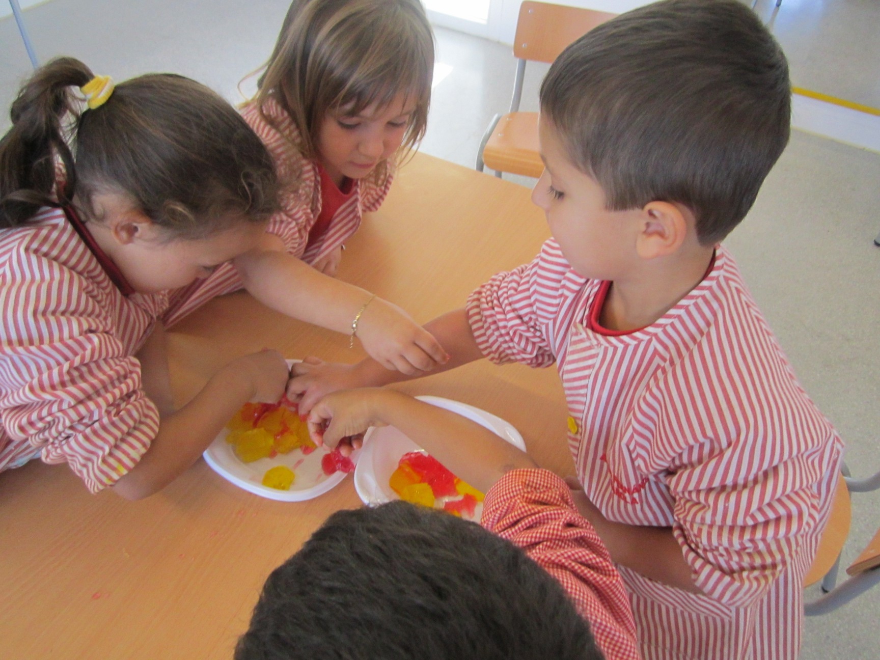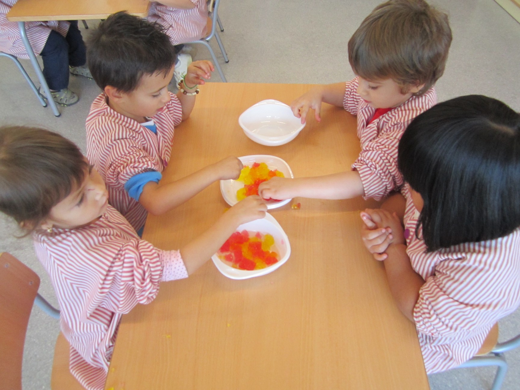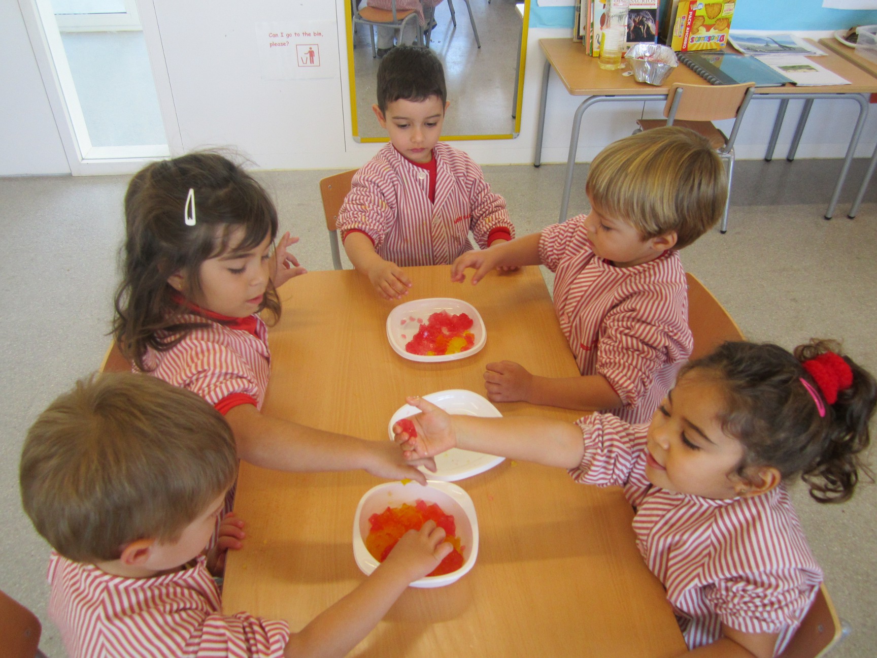 A L’escola Reus 21 durant la setmana de la Ciència tots els nens i nenes de P3 i P4 ens hem ajuntat per experimentar. Hem fet diversos tallers d’experiments: fem pastetes amb farina i colors, agafem gelatina dins de diversos líquids, fem les nostres empremtes i mirem amb lupes, separem la pasta de la farina, juguem amb els imans, canviem el color de l’aigua.
