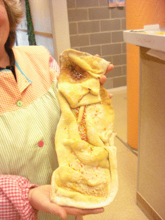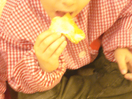 Després la barra de pa tallada a llesques, les vam posar en dues safates, i cada nen/a vam posar-hi oli i sucre a la llesca i vam poder menjar-ne tantes llesques com vam voler.