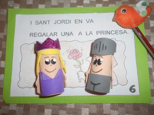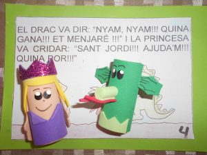 A classe acostumem a fer representacions amb titelles, per això agafem les titelles de dit que tenim dels personatges de Sant jordi. A més, els hi deixarem als infants la càmera i la tablet perquè facin fotos del conte amb les titelles.