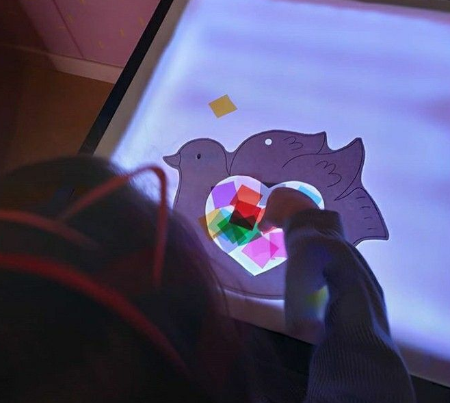 -4.1 Taula de llum amb coloms de la PAU: com si fossin vitralls, hauran d’omplir-los amb peces de colors com si fossin mandales. Es realitzarà a una de les aules d’infantil, disposaren de 4 taules de llum, que pertanyen a l’ambient de llums i hombres que es realitza a l’escola.