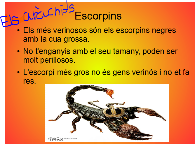 Lo que hemos aprendido es que hay muchos tipos arácnidos y que unos pueden ser peligrosos y otros no. También que las arañas no pueden engañarte por su tamaño porqué cuando más pequeñas son más peligrosas . (Dani, Arnau, Eloi, David y Agustín)