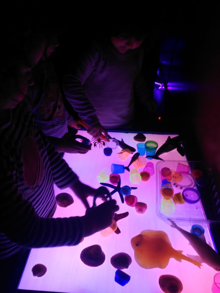 La mestra deixarà diferents materials com animals marins, sorra, pedretes de colors, papers de seda…. en diferents safates al costat de la taula de llum i els alumnes hauran de crear com s’imaginen el lloc on viuen els peixos.