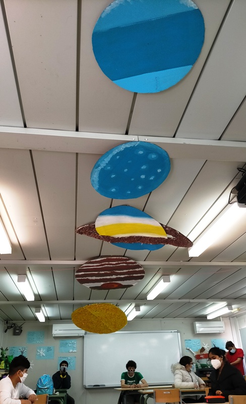 També hem decorat la classe amb els planetes que giren al voltant del sol i que formen el nostre Sistema Solar: Mercuri, Venus, la Terra, Mart, Júpiter, Saturn, Urà i Neptú. Plutó i Ceres són planetes nans.
