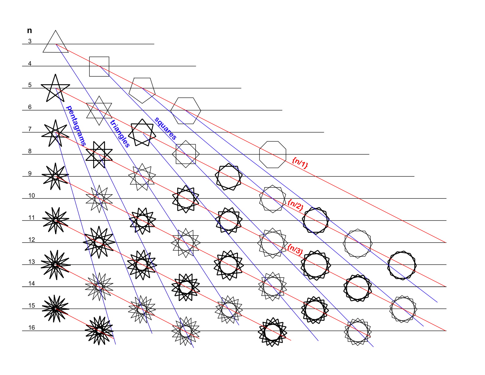 Ja hem vist a classe com es construeixen aquests polígons estrellats. Podeu trobar més informació, si voleu repassar el que vam explicar, i comprovar com es classifiquen segons els número de costats del polígon (Gènere), i el número de passos per fer l’enllaç (Espècie), a viquipèdia. Finalment podeu provar els vostres coneixements i fer les vostres propies construccions amb aquesta aplicació on podreu fer els vostres de polígons estrellats, ànims, i proveu de fer servir tots els vostres coneixements per fer el treball a l’aula.