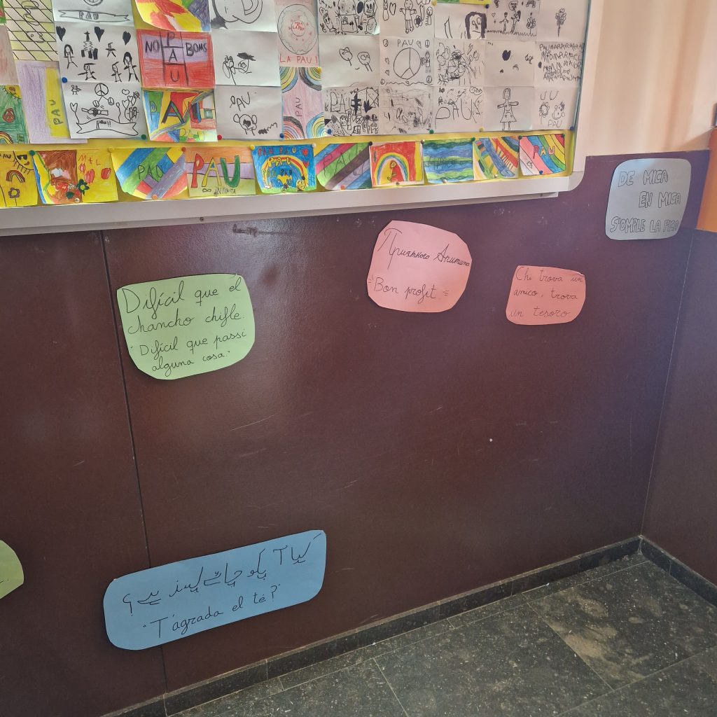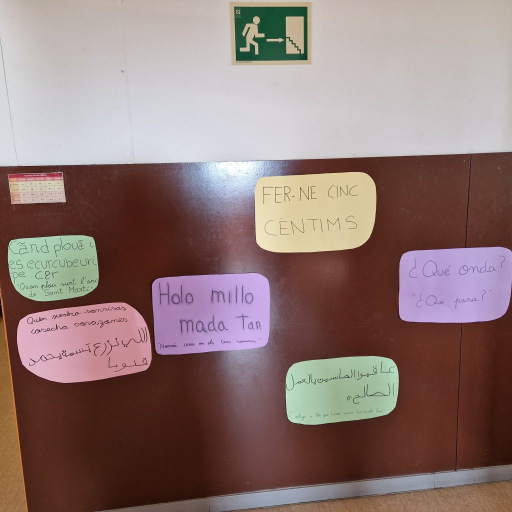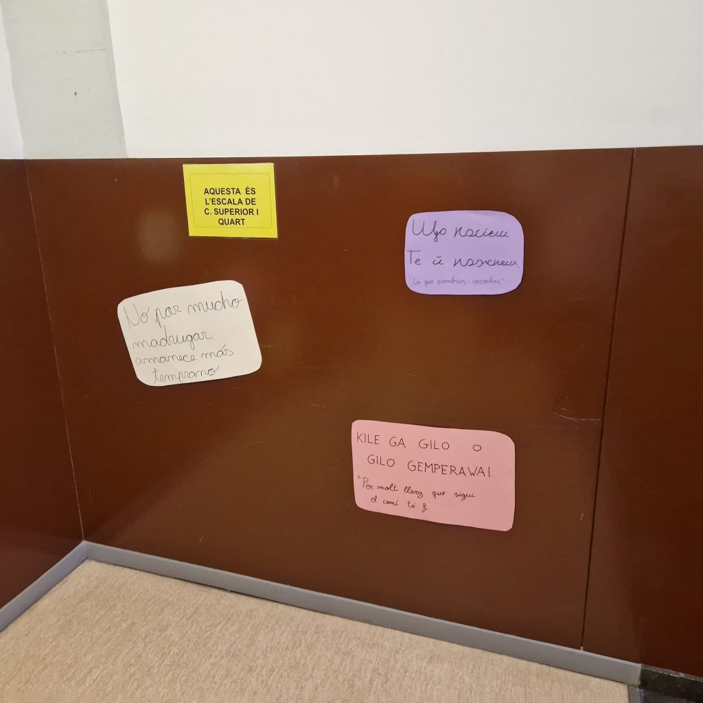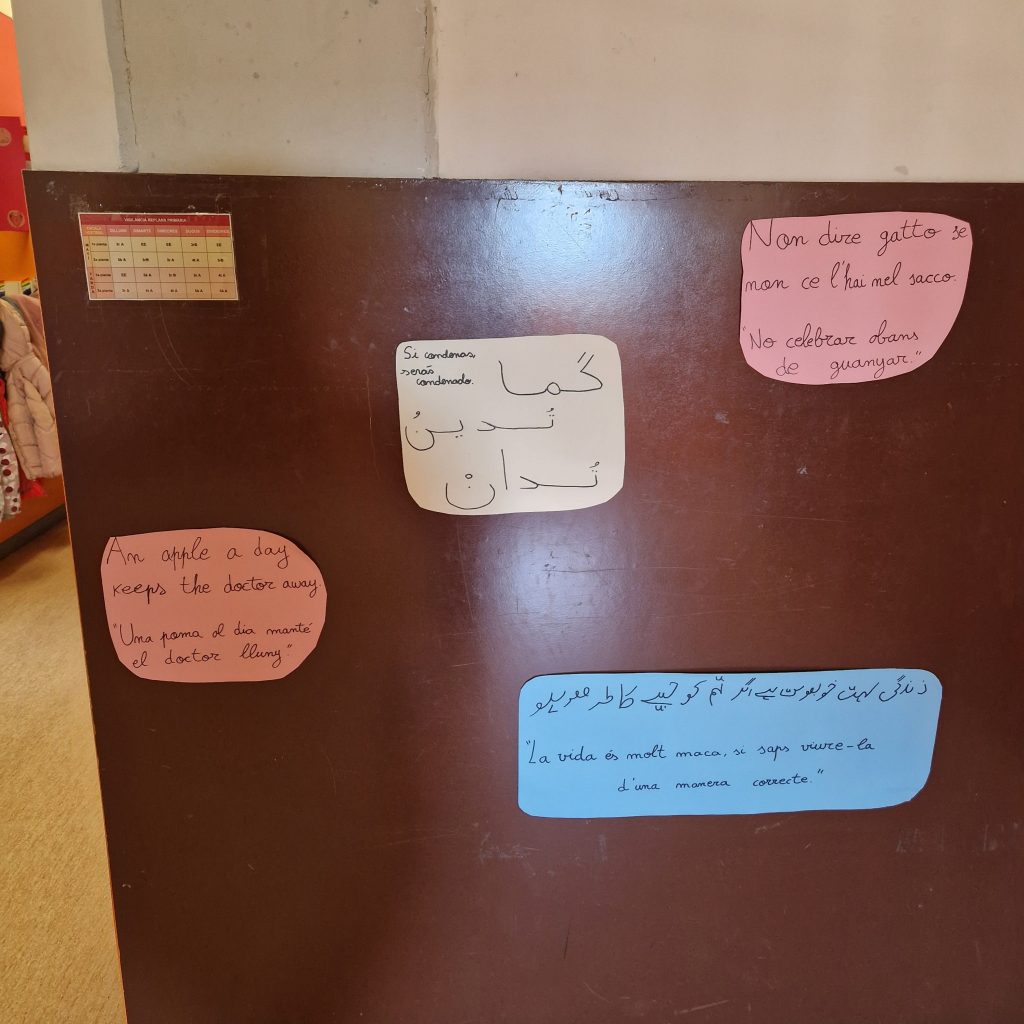 Primer vam demanar a totes les famílies de l’escola que ens fessin arribar una frase, dita, refrany en la seva llengua materna. Un cop ho vam reunir totes les frases vam realitzar, amb els alumnes d’aula d’acollida, el traspàs de totes elles en diverses cartolines per poder-les enganxar en diferents espais de l’escola. D’aquesta manera, tots els alumnes de la nostra escola han pogut observar i llegir les frases que ens han fet arribar des de casa.