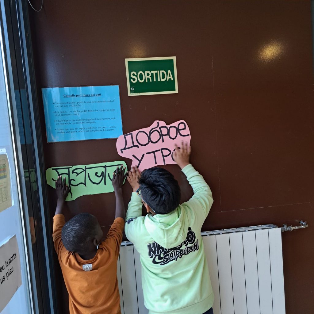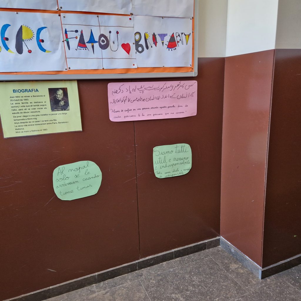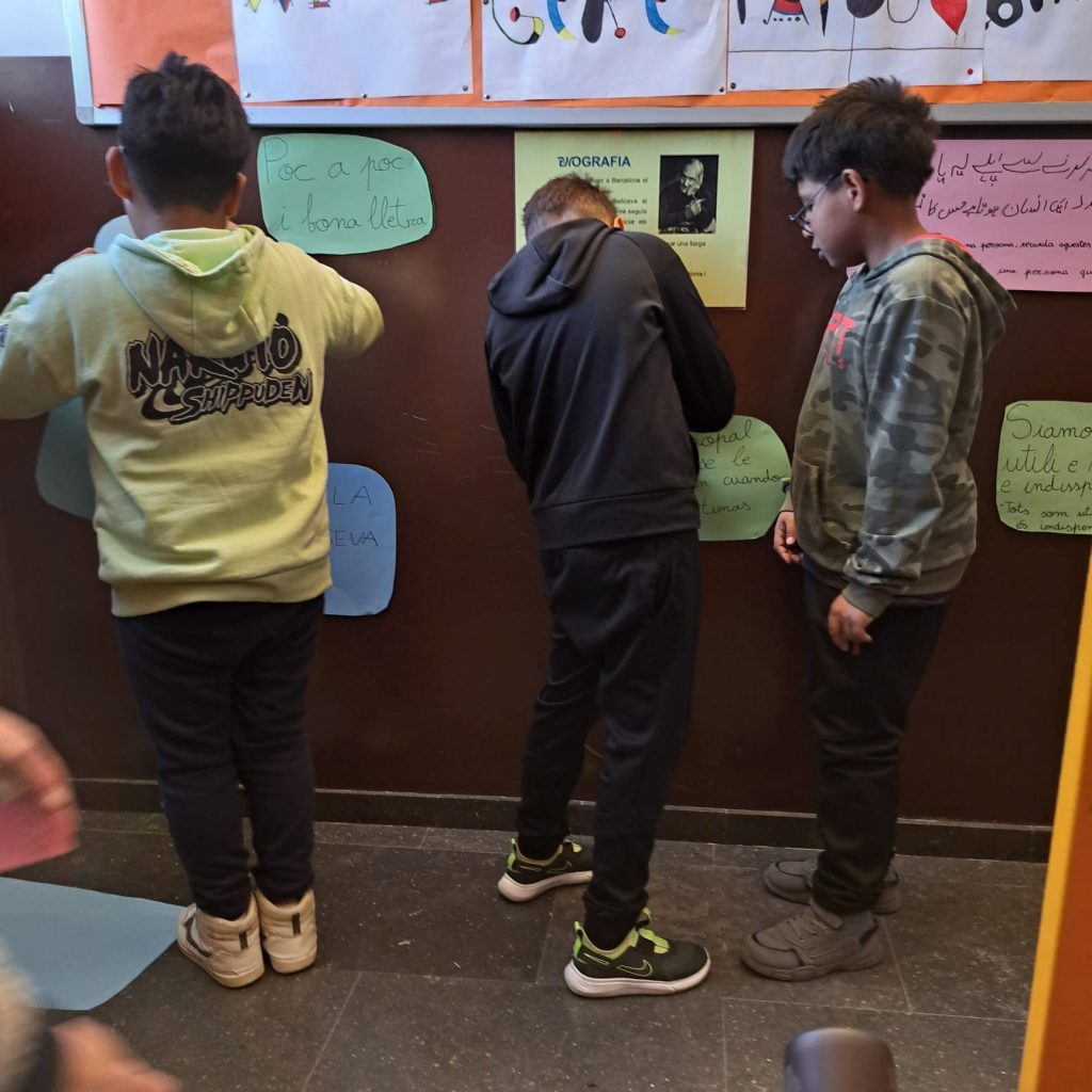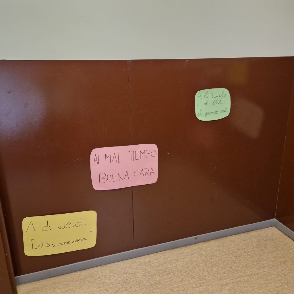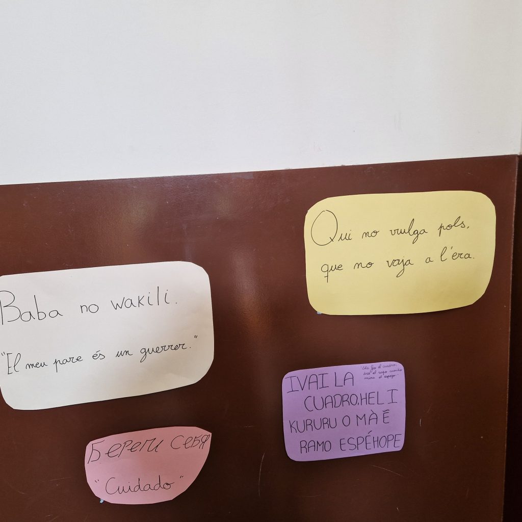 Primer vam demanar a totes les famílies de l’escola que ens fessin arribar una frase, dita, refrany en la seva llengua materna. Un cop ho vam reunir totes les frases vam realitzar, amb els alumnes d’aula d’acollida, el traspàs de totes elles en diverses cartolines per poder-les enganxar en diferents espais de l’escola. D’aquesta manera, tots els alumnes de la nostra escola han pogut observar i llegir les frases que ens han fet arribar des de casa.