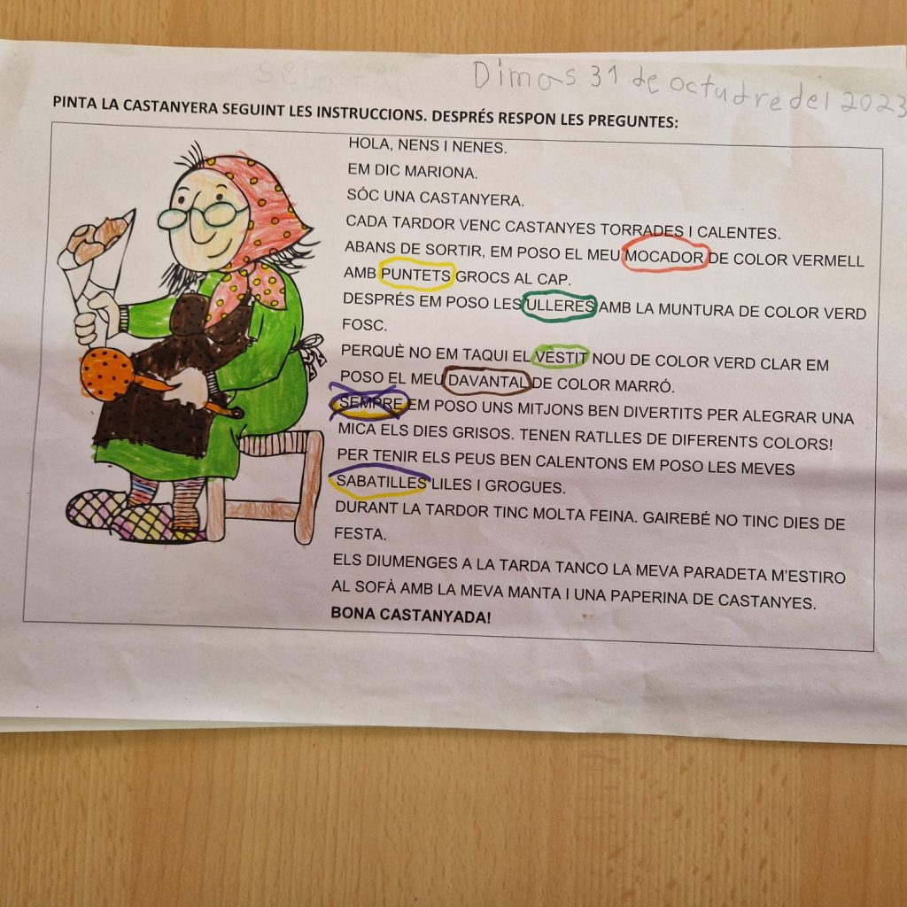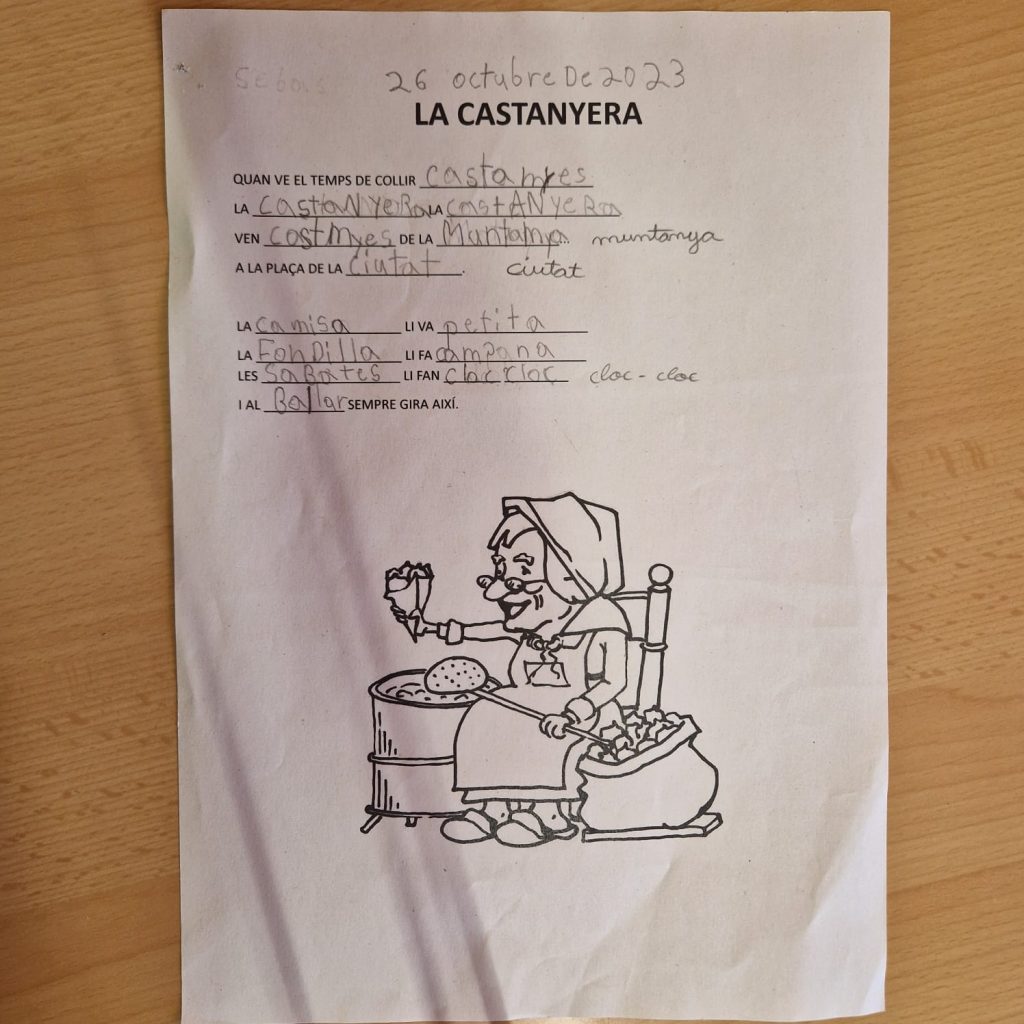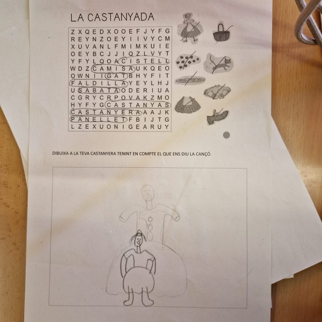 Després d’explicar i veure el conte de la Castanyera, aprendre una miqueta de vocabulari: castanyes, paperines, torrar, panellets,…etc, i escoltar les diferents cançons, aquest curs, vam celebrar la festa de la Castanyada al pati ballant en grups.