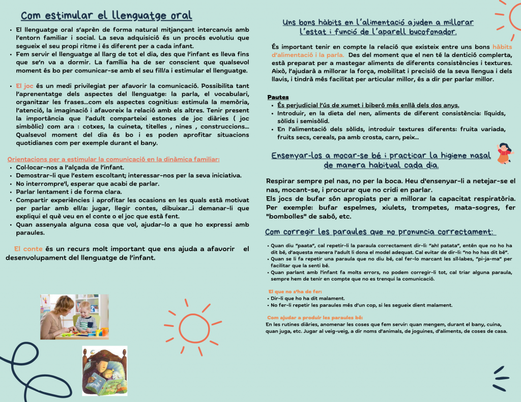 • APROFITAR LES OCASIONS per cantar, llegir contes, jugar, ballar i així reforçar vincles. Proposar jocs d’imitació on hagin de repetir paraules senzilles (joc dels dits, ralet- ralet…) per estimular-ne el llenguatge. Deixar experimentar amb diferents textures i materials (manipular materials com fang, farina… o caminar descalç per la sorra, gespa), així es fomenta el desenvolupament de la imaginació, la creativitat i l’interès per coses noves.