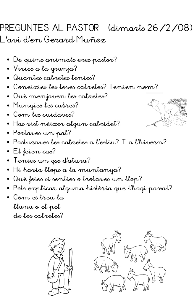 Ens va visitar a la classe en David, l’avi d’en Gerard Muñoz, que quan era jove,va ser pastor de cabretes. Ens va explicar com les cuidava, com les alimentava, que les portava a pasturar, … També ens va explicar que a vegades, els seus gossos l’avisaven de que s’acostava algun llop, imagineu-vos quina por!! Va ser molt interessant, ens va agradar molt i li vàrem fer preguntes, les voleu saber?