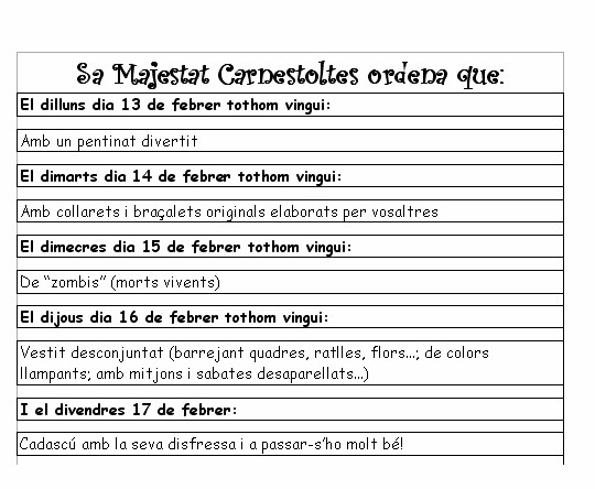 Avui hem rebut un mail del Sa Majestat Carnestoltes, rei dels poca-soltes. Això és el que ens mana per a la setmana que ve: