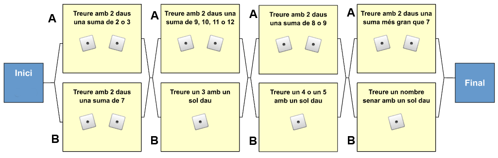 En aquest joc hauràs de fer una cursa d’obstacles. Es tracta d’intentar arribar des del començament fins al final amb el mínim nombre de tirades. Evidentment, hauràs de tenir una mica de sort, però et pot ajudar a intentar esbrinar quina és l’opció amb més probabilitats cada vegada. (No t’anirà malament fer-te una taula amb la combinació de dos daus i comptar els resultats de cada suma).
